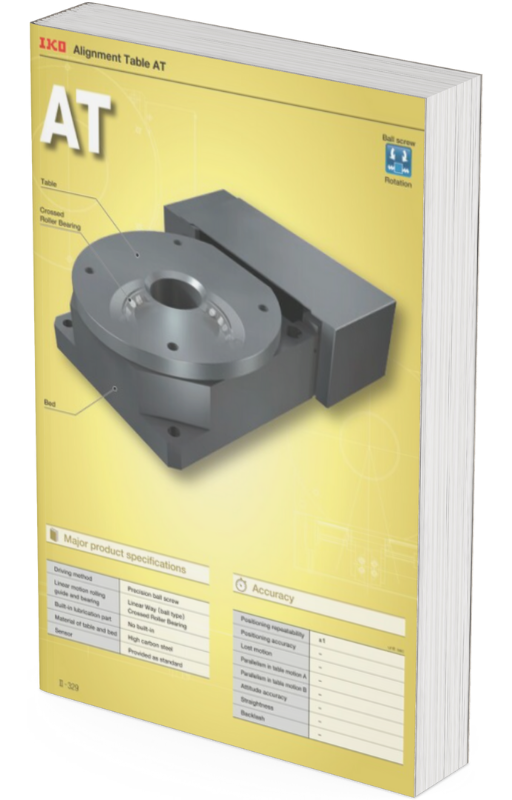 A Mesa de Alinhamento AT da IKO é um mecanismo de posicionamento rotativo de alta precisão e rigidez, projetado para ajustes angulares finos em equipamentos de medição, inspeção e montagem. Seu design combina base e mesa em aço de alta rigidez com um rolamento de rolos cruzados IKO, garantindo estabilidade, suavidade e durabilidade no movimento rotacional.