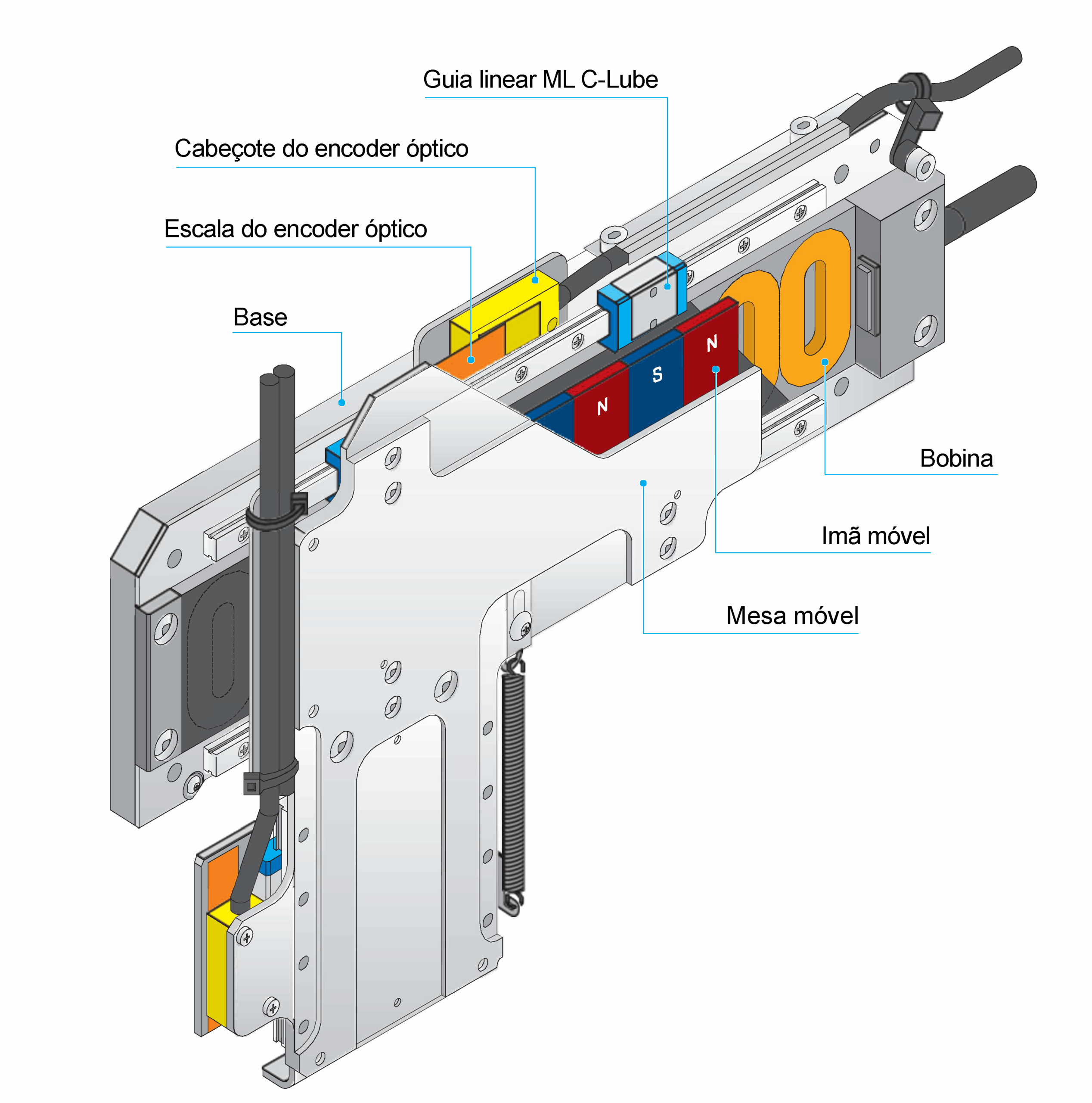 A mesa móvel integra ímãs de neodímio e uma escala linear óptica, enquanto a base contém as bobinas e o cabeçote do encoder. Esse conjunto garante resposta rápida, grande força de empuxo e operação estável, mesmo em dimensões reduzidas.